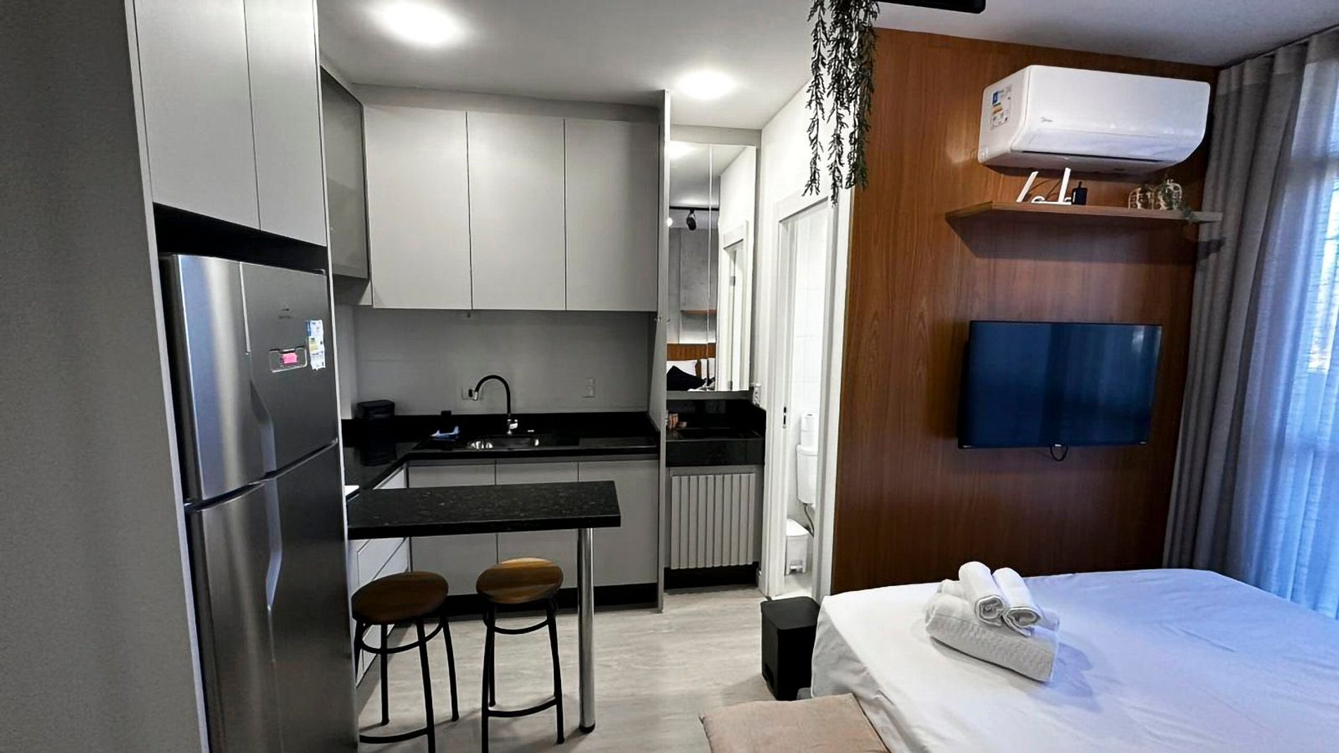 Hospede-se com conforto e praticidade neste studio novo, moderno e completo, localizado no sofisticado bairro Ecoville, próximo ao Shopping Barigui, Parque Barigui e Carrefour.